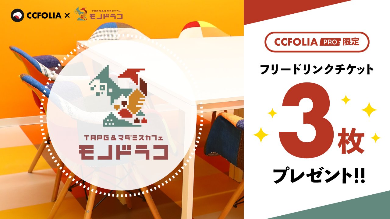 CCFOLIA PRO ユーザーを対象に、初回利用の会員登録時「フリードリンク無料チケット」を3枚(1200円相当)が貰えるキャンペーンが始まりました! https://ccfolia.com/par…