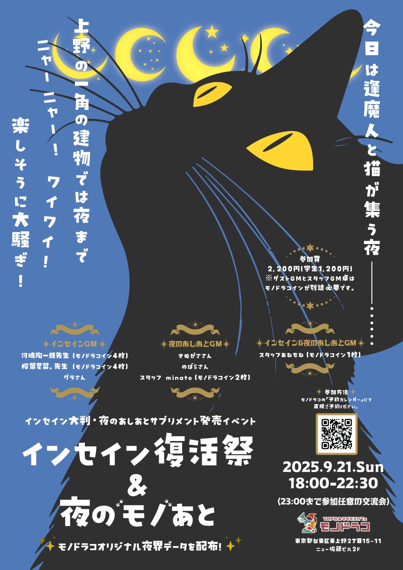 インセイン大判・夜のあしあとサプリメント発売イベント 「インセイン復活祭&夜のモノあと」 今日は逢魔人と猫が集う夜──…… 上野の一角の建物では夜までニャーニャー!ワイワイ!楽しそうに大騒ぎ!…