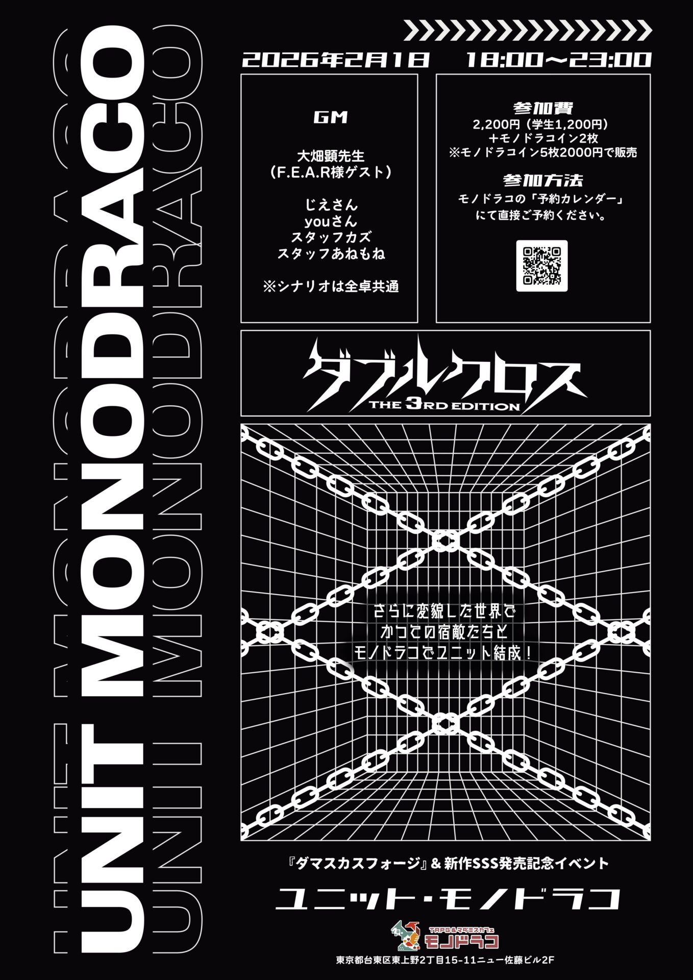 ダブルクロス The 3rd Edition 『ダマスカスフォージ』&新作SSS 発売記念イベント さらに変貌した世界で かつての宿敵たちとモノドラコでユニット結成! 開催日程 2026年2月1日 1…