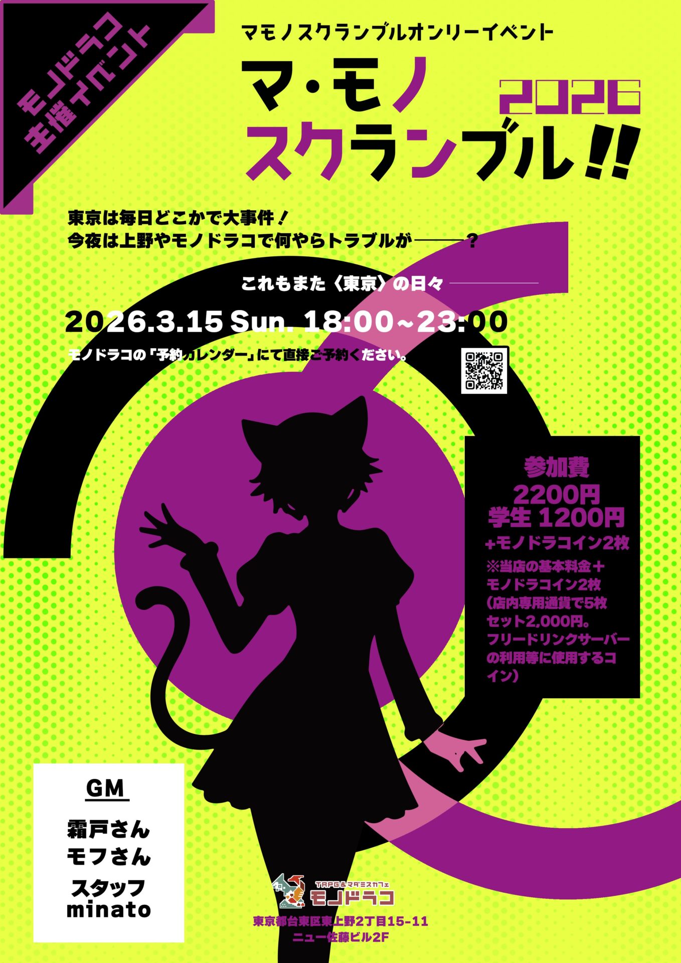 3/15(日) 18:00〜23:00開催! 東京は毎日どこかで大事件! 今夜は上野やモノドラコで何やらトラブルが────? PL募集は2/7、18:00〜 ご参加いただいた方全員にシリアルナンバー入…