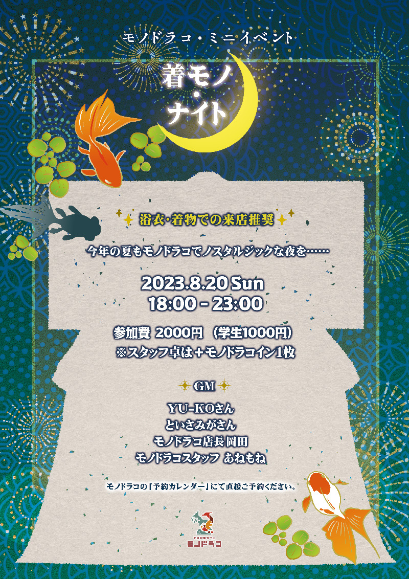 2023.8.20 18:00〜23:00 浴衣・着物での来店推奨! 夏を楽しむ納涼イベント開催決定!みんなで浴衣を着て夏らしいシナリオを遊びましょう 卓募集はこちらをご覧ください!要チェックです h…