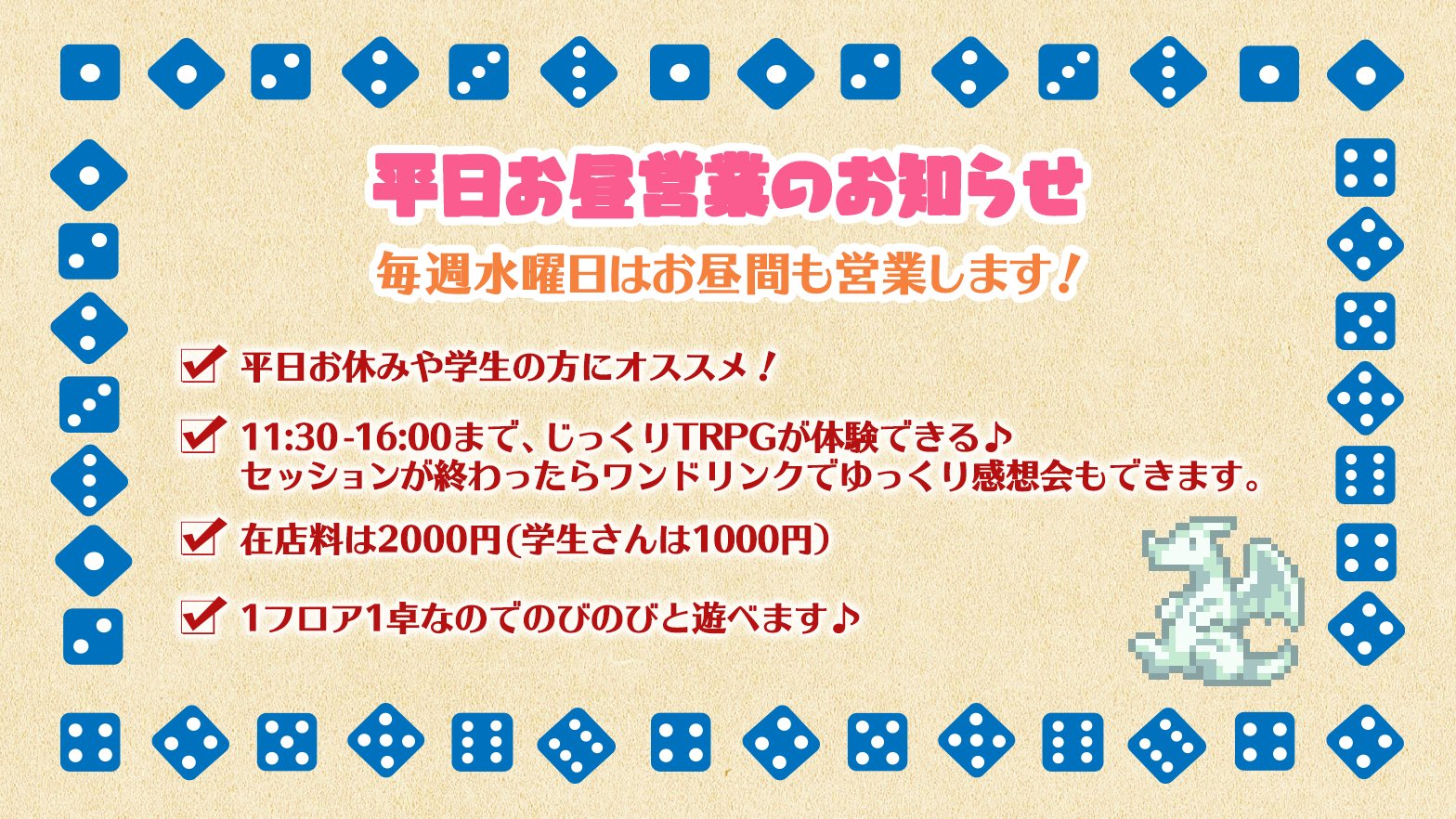 モノドラコは6月より 毎週水曜日の平日お昼営業をスタートしました。 スタッフ卓、お客様GM卓、お身内卓でもご利用いただけます お昼から思いっきり TRPGを楽しめるチャンス! 予定卓や空き状況はこちら…