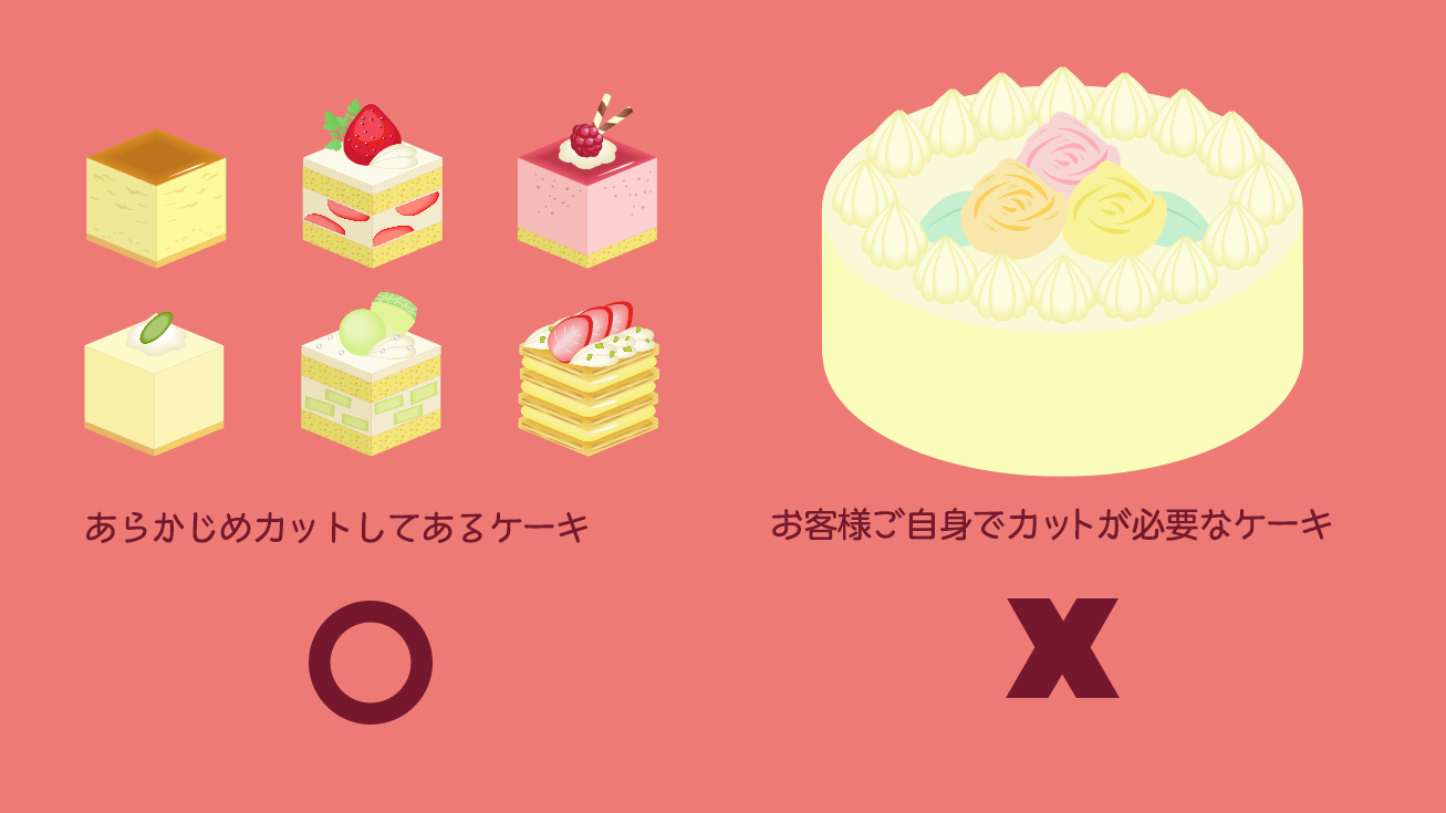 感染症対策の点から 【お客様ご自身で切り分けが必要になるタイプのホールケーキ】 のお持ち込みはご遠慮ください。 また、余った飲食物を別のテーブルでシェアする行為もご遠慮いただければと思います。余った飲…